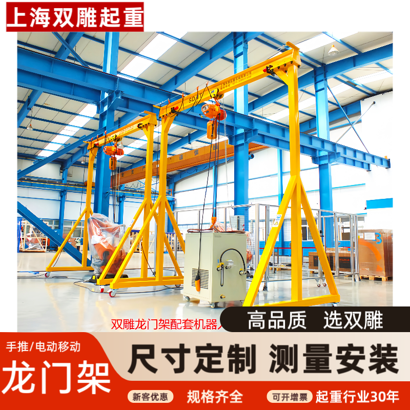 此款龍門架适用於設備安裝與調試、模具的裝卸與維修,故又叫做模具吊。