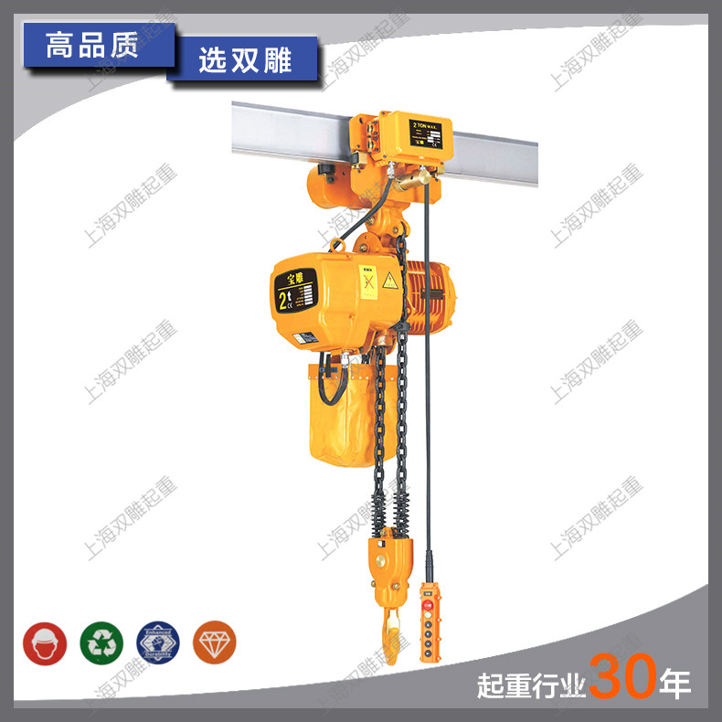 HHBB日式環鏈電動葫蘆是上海雙雕起重機械有限公司設計生産的一款輕小型起重設備。由電動機,傳動機構和鏈輪組成。起重量爲 0.3-32噸,起升高度爲3~120米。日式環鏈電動葫蘆的使用範圍很廣,應用於車間、倉庫、風力發電、物流、碼頭、建築等場合。此款電動葫蘆與龍門架或者行車配合使用,可用於吊運或者裝卸貨物,也可以用於精密模具的安裝調試與維修。操作人員用按鈕在地面跟随操縱,也可在操控室内操縱或採用有線(無線)遠距離控制。這款電動葫蘆既可固定懸挂使用,又可配電動單軌小車及手推/手拉單軌小車行走使用。